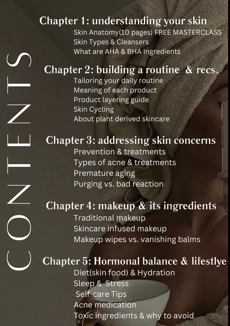 This roadmap includes serious key elements in detail. Remember that skincare is not just about products; lifestyle factors like skin foods, hydration, hormonal balance, carcinogens, holistic practices, a strategic plan etc. also impacts your skin's health!